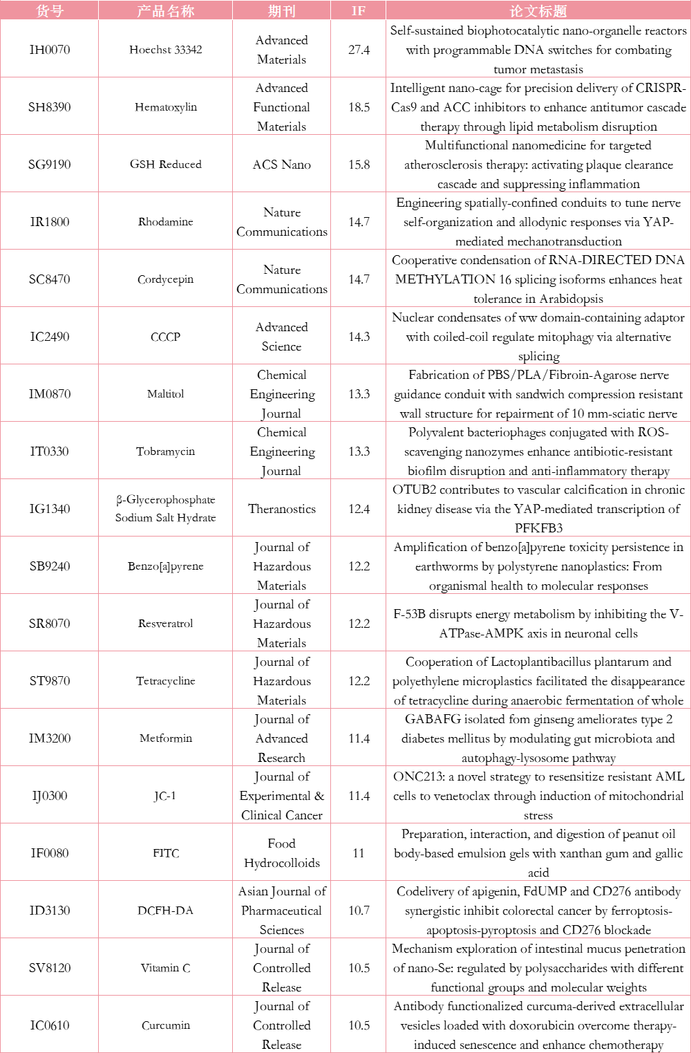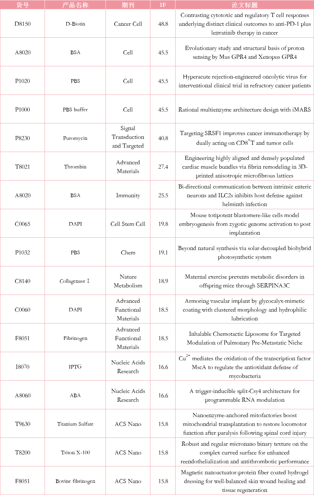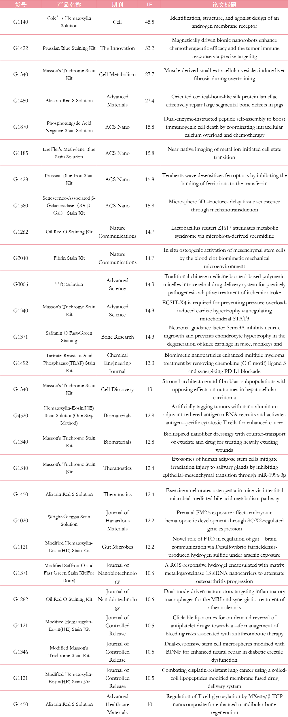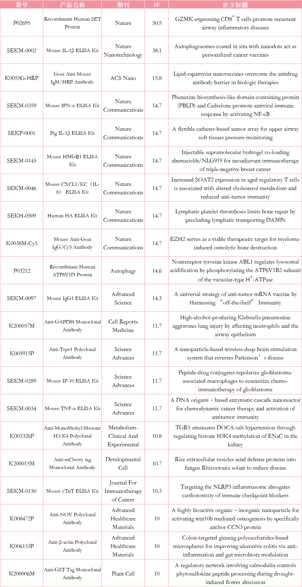 此外,我们精心挑选了10篇IF超过27.4分的杰出文献,涵盖了重组蛋白、染色液、ELISA试剂盒、蛋白提取试剂盒、细胞分离液、生化试剂盒、小分子化合物等多种产品种类,供有需要的友友们参考。