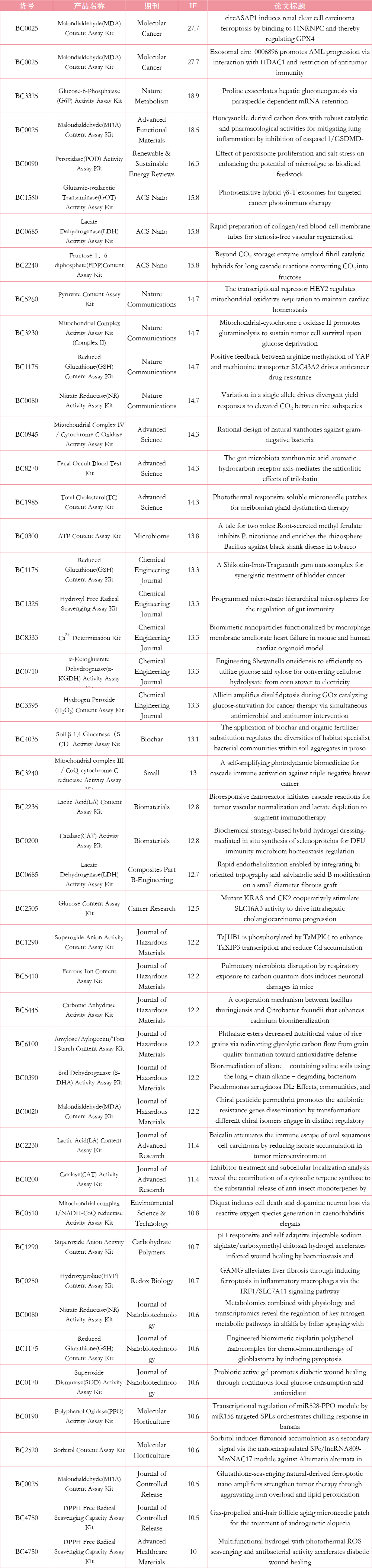 本月的表现尤为亮眼,单月引用文献达2510篇,引用产品数量达3356个;单月总影响因子为16424.3,最高影响因子达50.5。其中本月影响因子20+的文献多达38篇,影响因子10+的文献高达422篇,呈现出稳步上扬的积极态势,突显了Solarbio产品在研究中的关键作用,也预示了Solarbio在高水平研究中的影响力正稳步扩大。