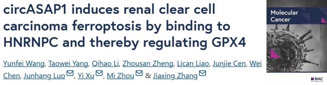 标题:circASAP1 induces renal clear cell carcinoma ferroptosis by binding to HNRNPC and thereby regulating GPX4