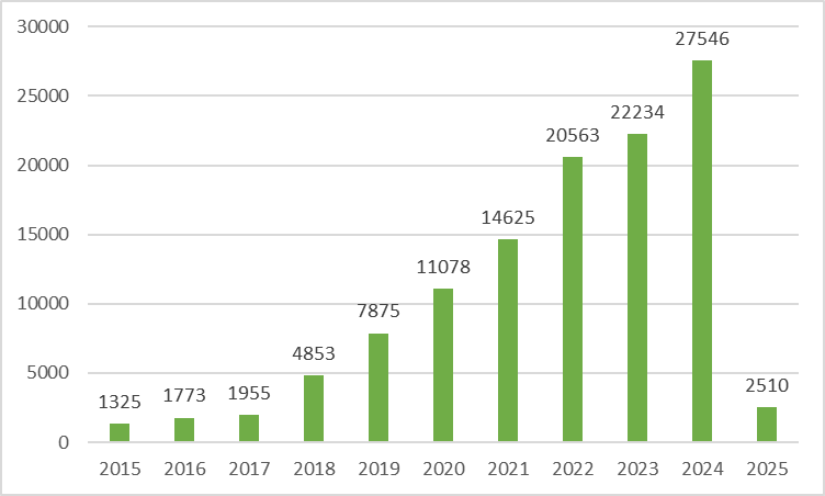历年的年度SCI文献数量分布(来源:第三方平台)